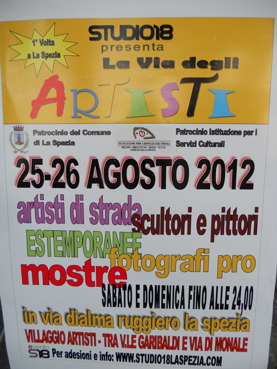 Il 25 e 26 Agosto si è svolta a La Spezia "La via degli Artisti", manifestazione organizzata dall'associazione culturale Studio18 con la presenza di molti giovani artisti che si sono distinti per le loro opere nel campo della pittura, della scultura, della fotografia e della letteratura, oltre ad artisti di strada di vario genere.